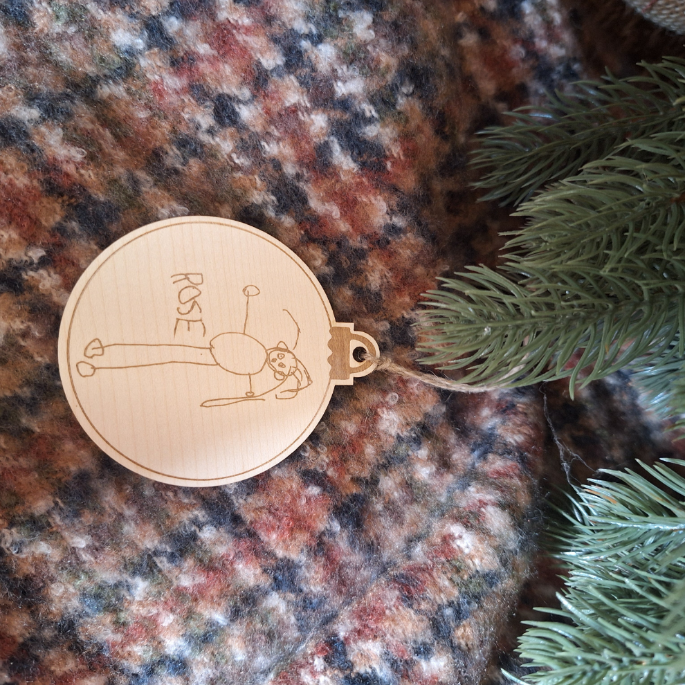 Cette boule de Noël en bois est un ajout unique et personnalisé à votre décoration de Noël grâce aux dessins de votre enfant.