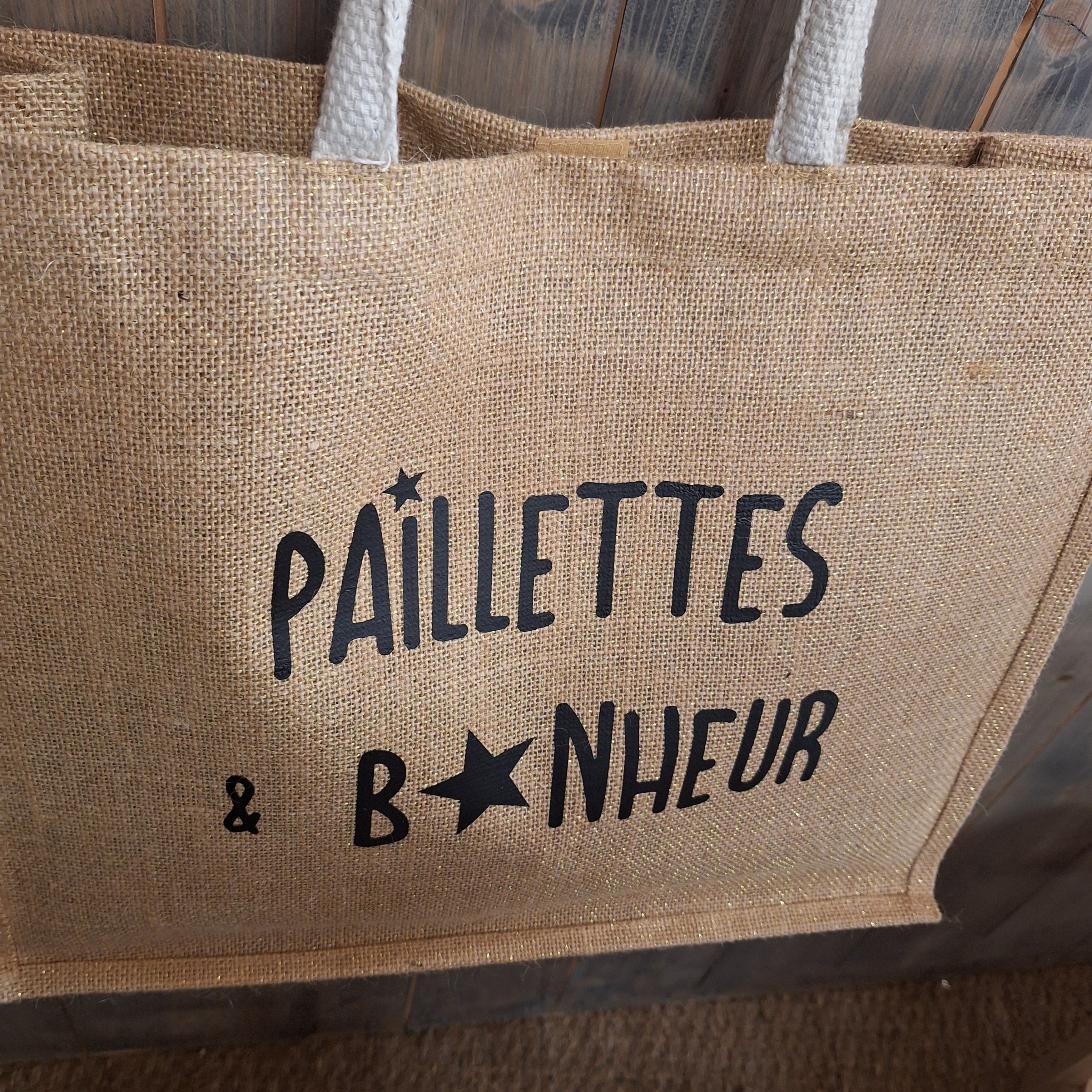 Ce sac en jute beige avec ses paillettes or personnalisable est une idée de cadeau pour les fêtes.