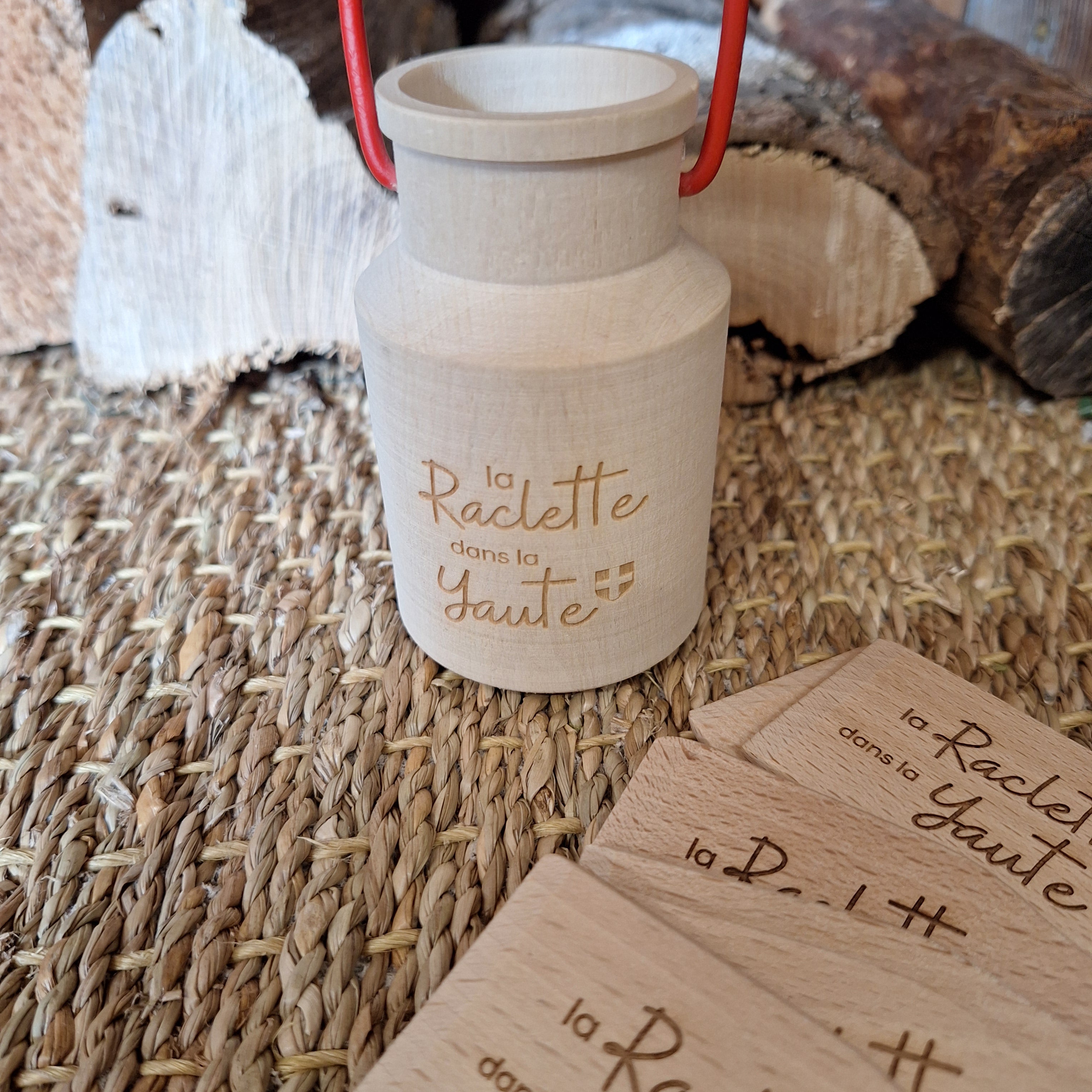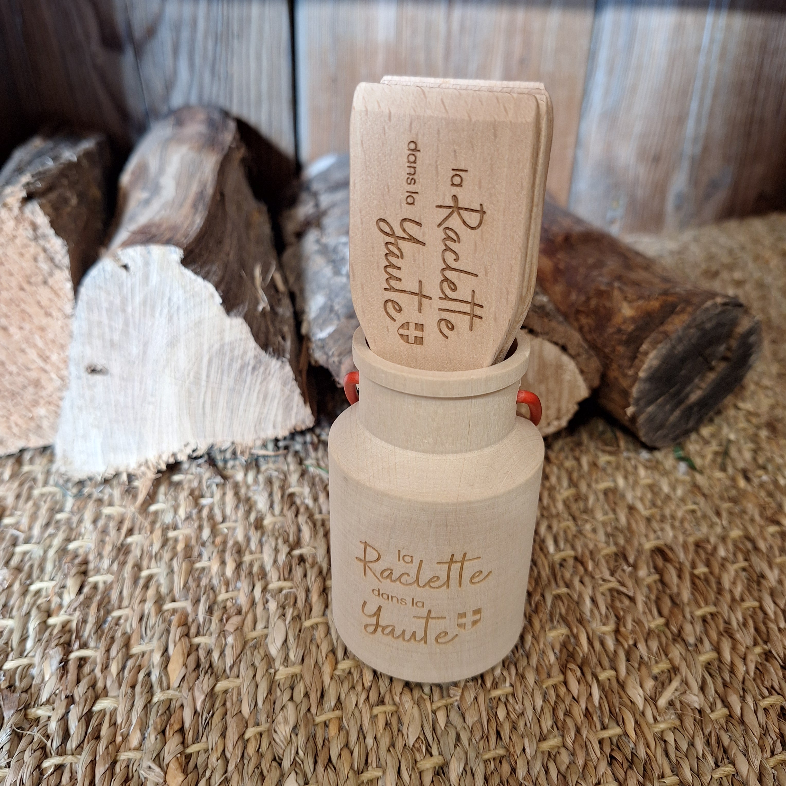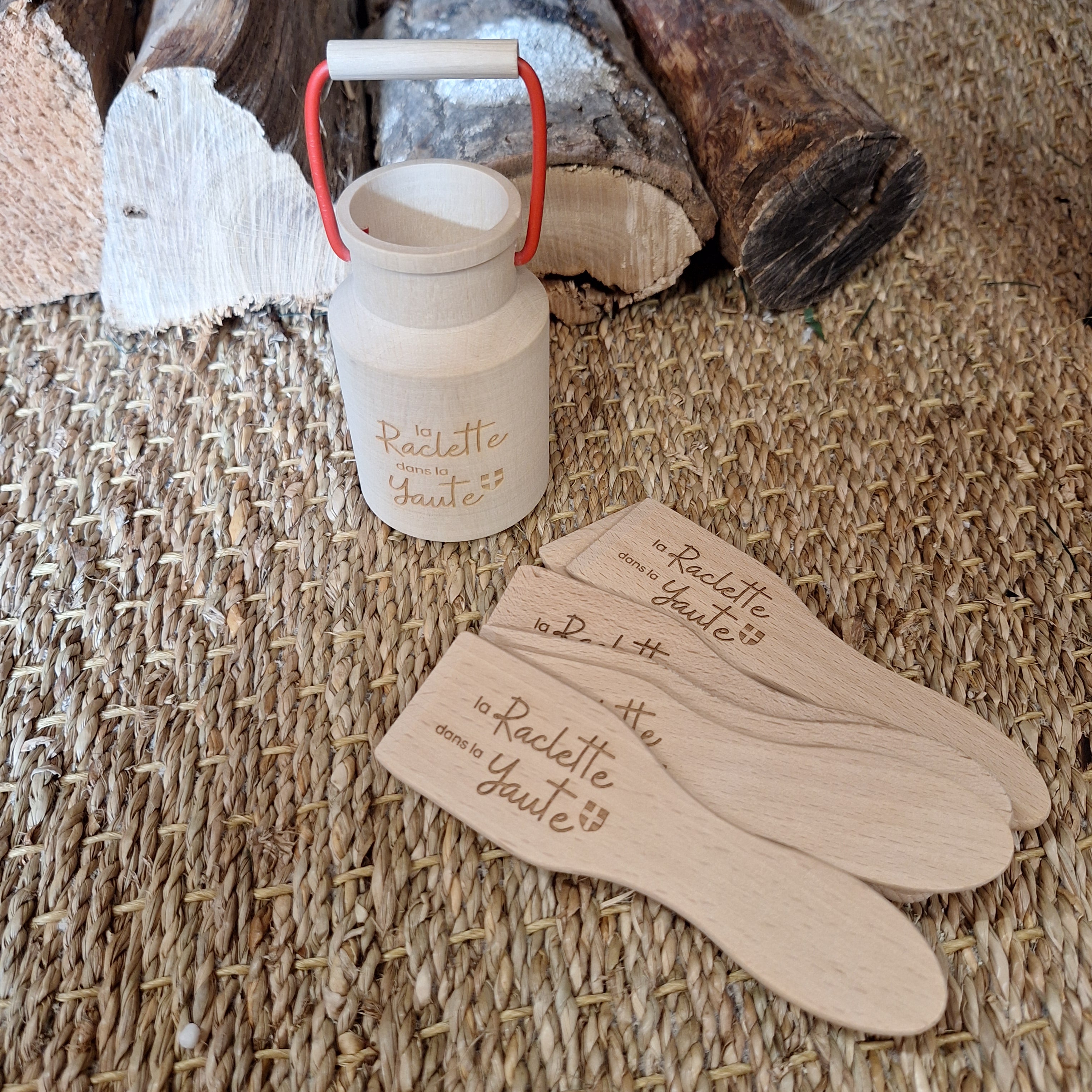 Régalez-vous avec cet ensemble de 6 spatules à raclette personnalisées "La raclette dans la yaute" et sa bouille à lait en bois.